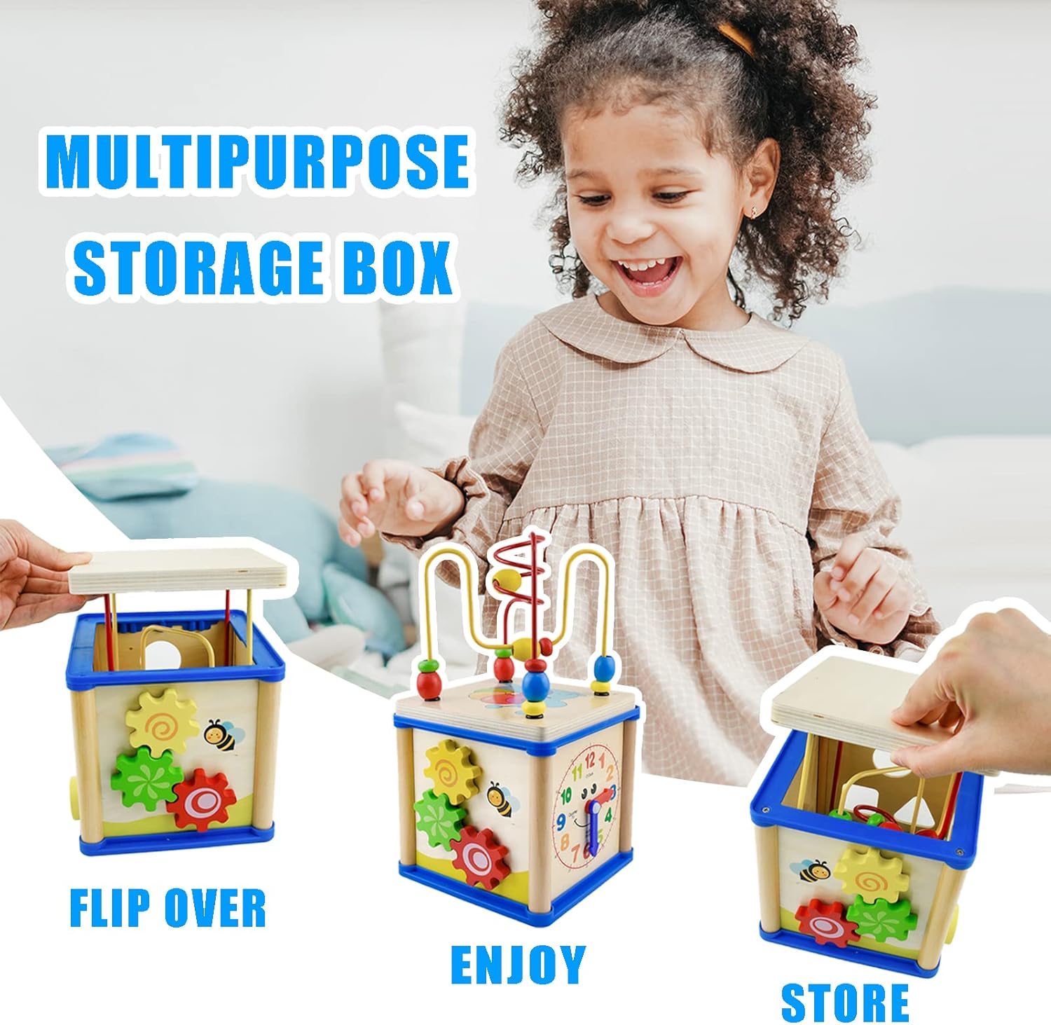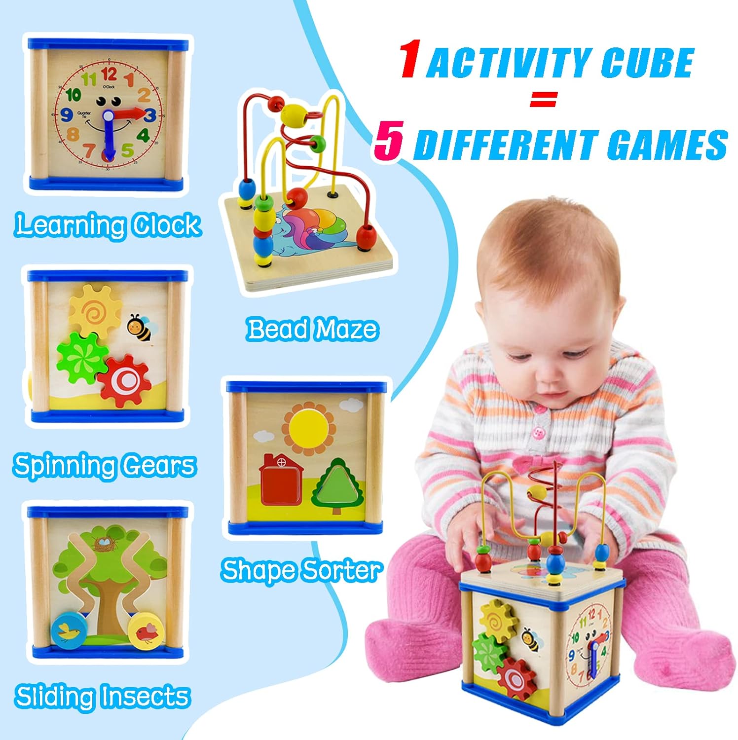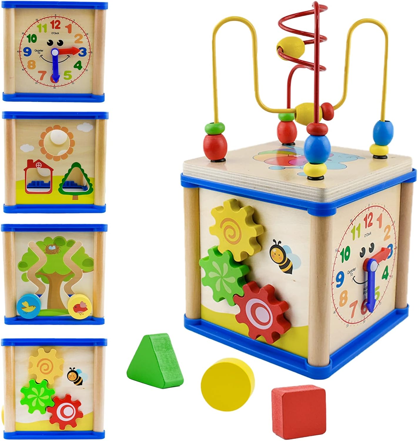 🎯 5-in-1 learning: Bead maze, shape sorter, bird slide, clock, and gear patterns
